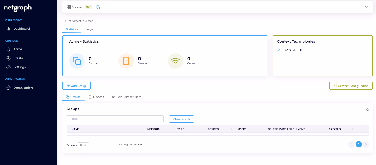 Navigate to your Netgraph Admin-Portal and log in. Locate you context created in previous step and click the “Context configuration” button on the right. #