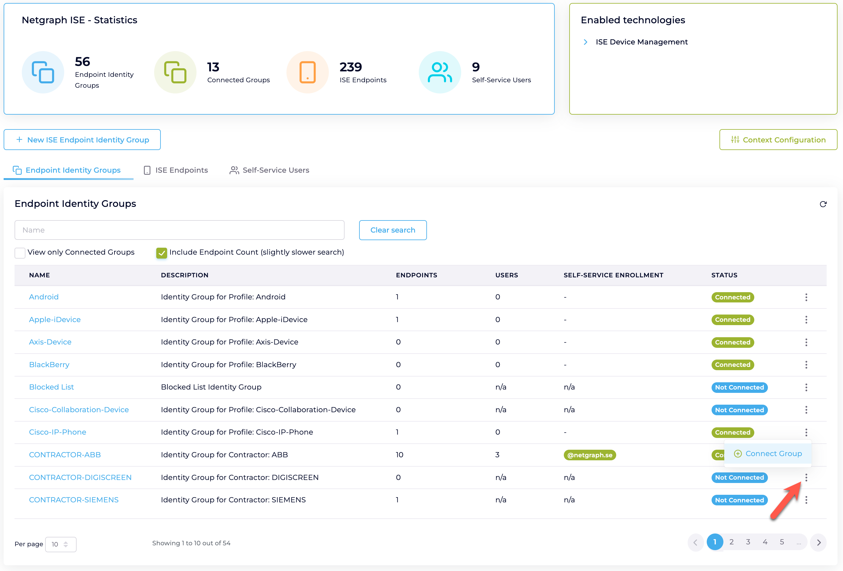 Before delegating administrative responsibilities, the selected Endpoint Identity Group must be connected to the Netgraph platform.