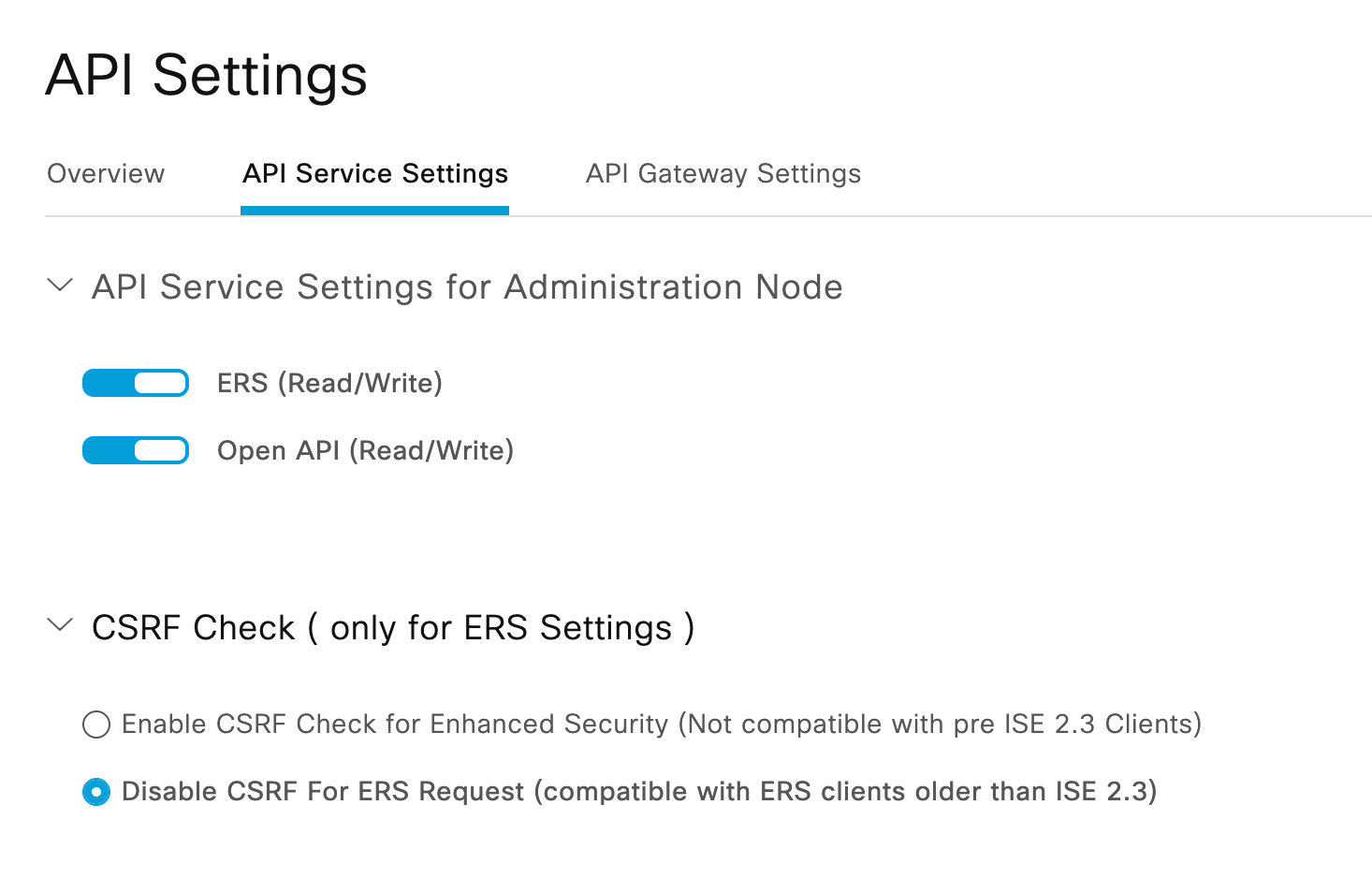 In the ISE Portal, navigate to Administration -> System -> Settings -> API Settings.