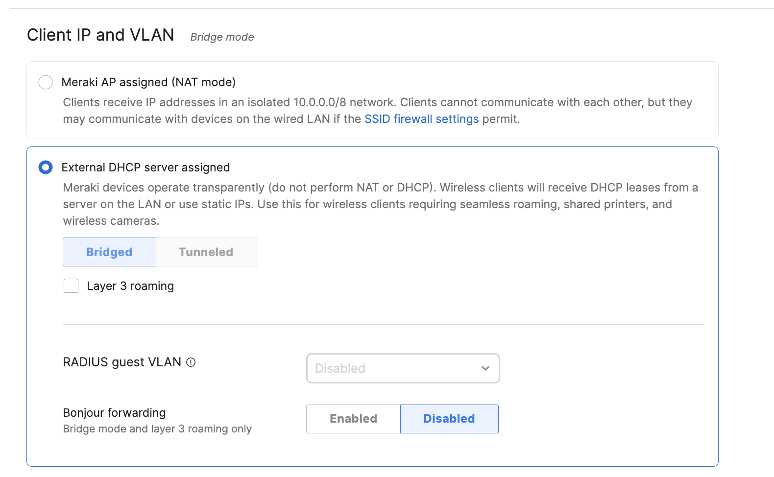- In Meraki Dashboard navigate to: Wireless-> Access control-> Client IP and VLAN page.