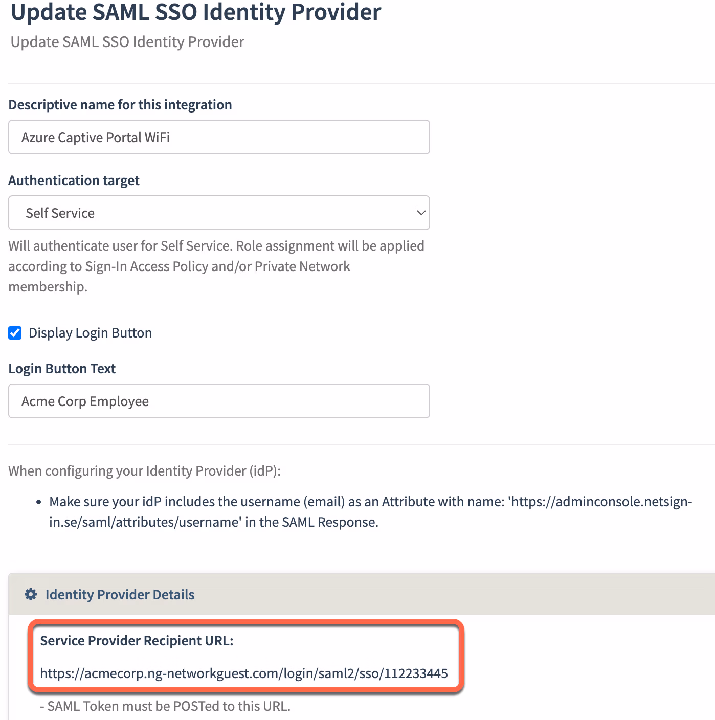 Please note the Service Provider Recipient URL (above), it’s a unique identifier that is needed when configuring your idP in the next step.