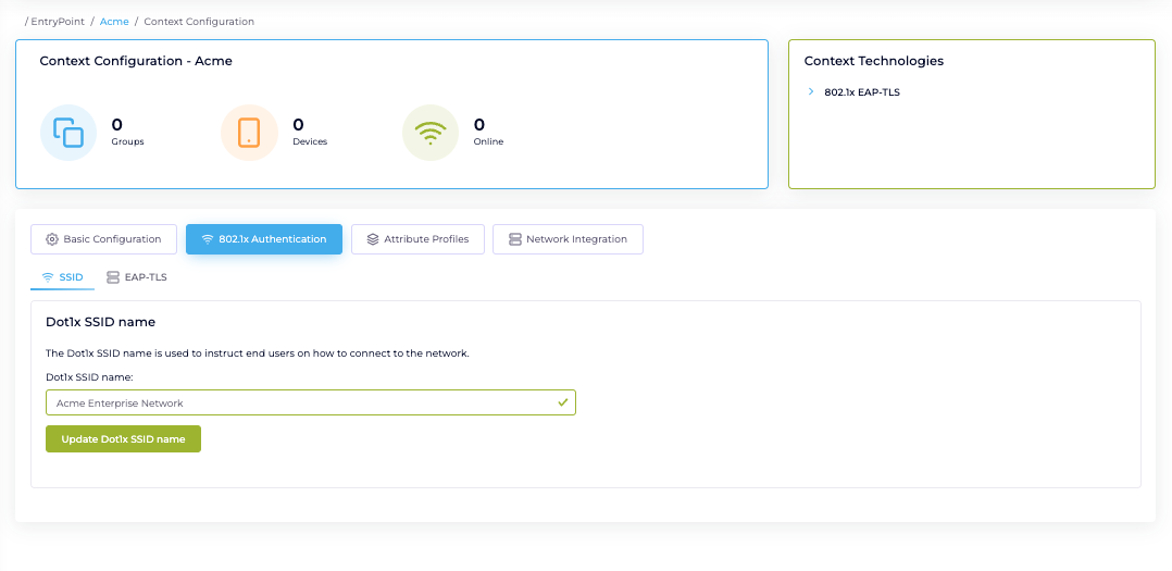 Click on “802.1x Authentication”. On the “SSID” tab, configure the SSID name and hit the “Update Dot1x SSID name” button to save. #