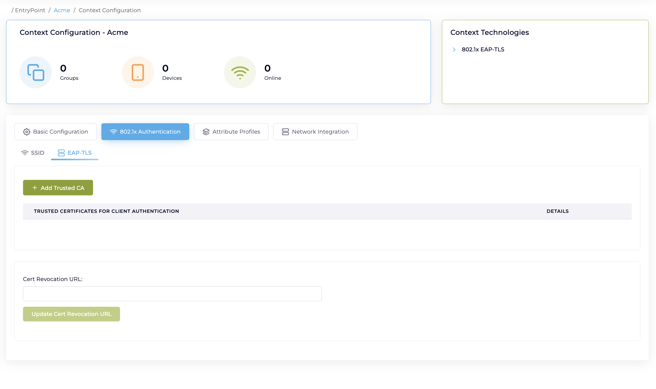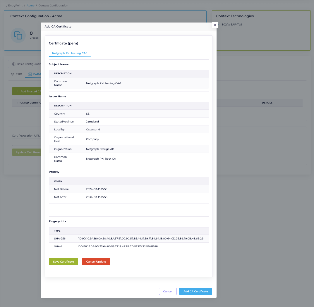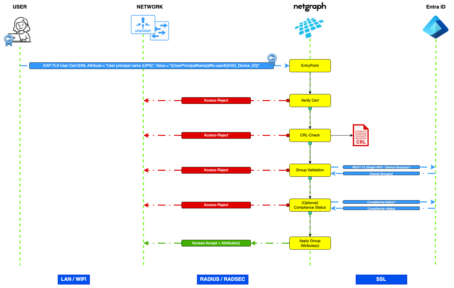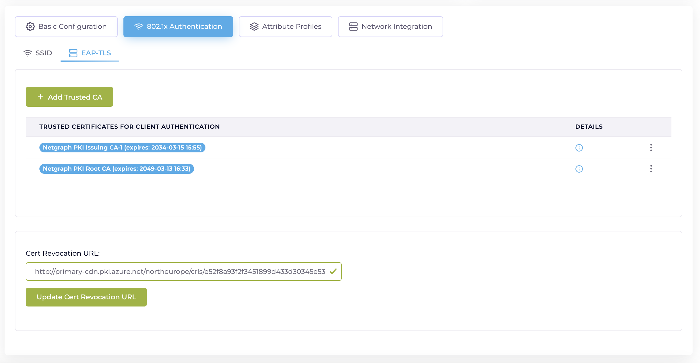 This guide shows how to setup the 802.1x Authentication (EAP-TLS) in a Netgraph EntryPoint RADIUSaaS context. This guide will setup a trust between EntryPoint RADIUSaaS context and the Microsoft Cloud PKI (Intune) and configure EntryPoint RADIUSaaS context to trust client authentication certificates issued by the Microsoft Cloud PKI (Intune).