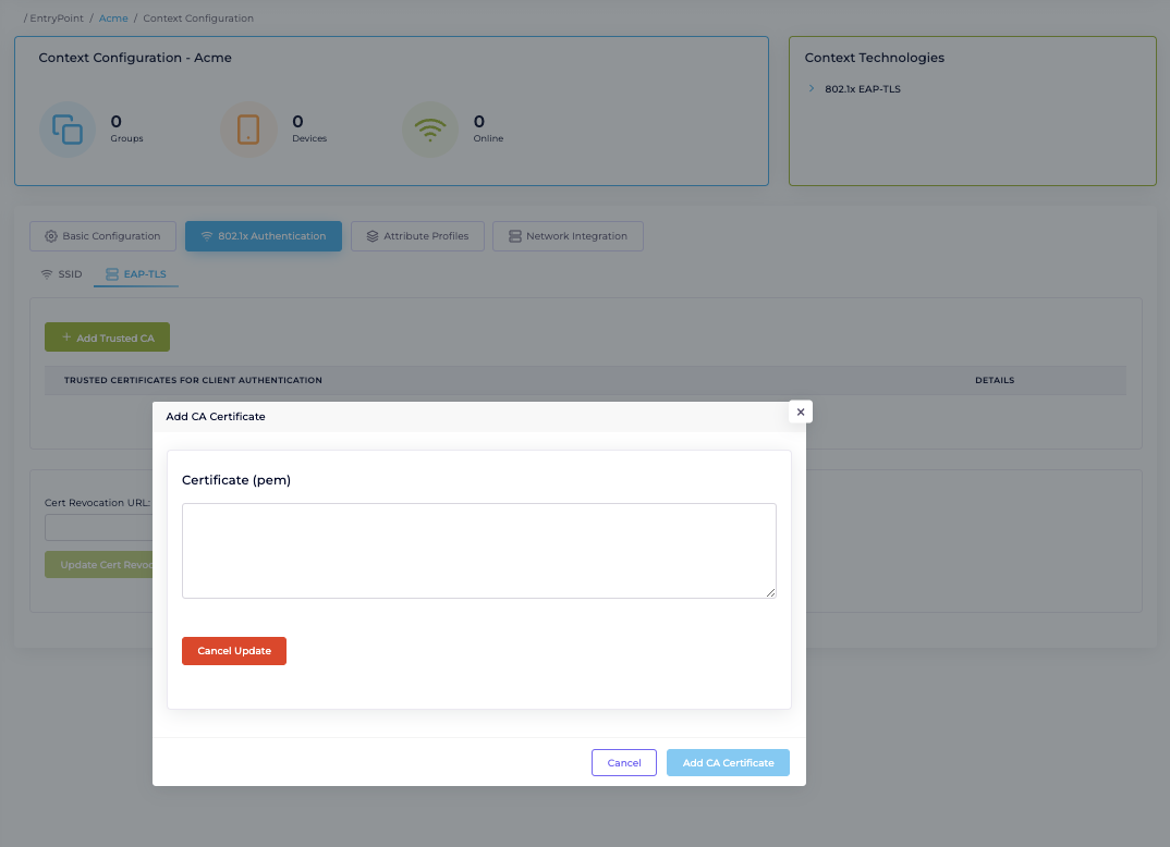 - Click the “Add Trusted CA” -> “Change Certificate” and paste you certificate (in PEM format) into the text box.